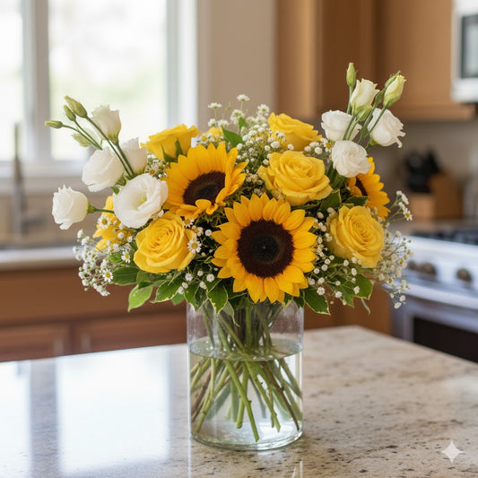 Sunny Day Basket Arrangement | Sunflowers, Roses & Baby’s Breath