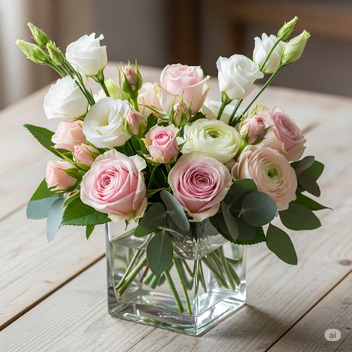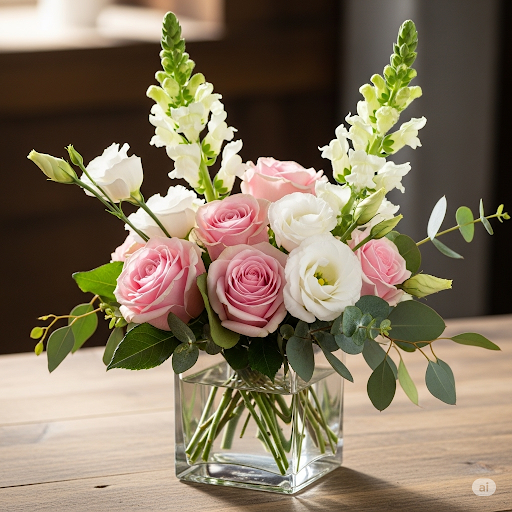 Delight in the timeless beauty of our Blushing Beauty arrangement—a graceful blend of soft pink roses, pure white lisianthus, and snapdragons, artfully accented with lush eucalyptus greenery. This sophisticated bouquet is presented in a clear glass vase, showcasing its romantic color palette and fresh, airy design.