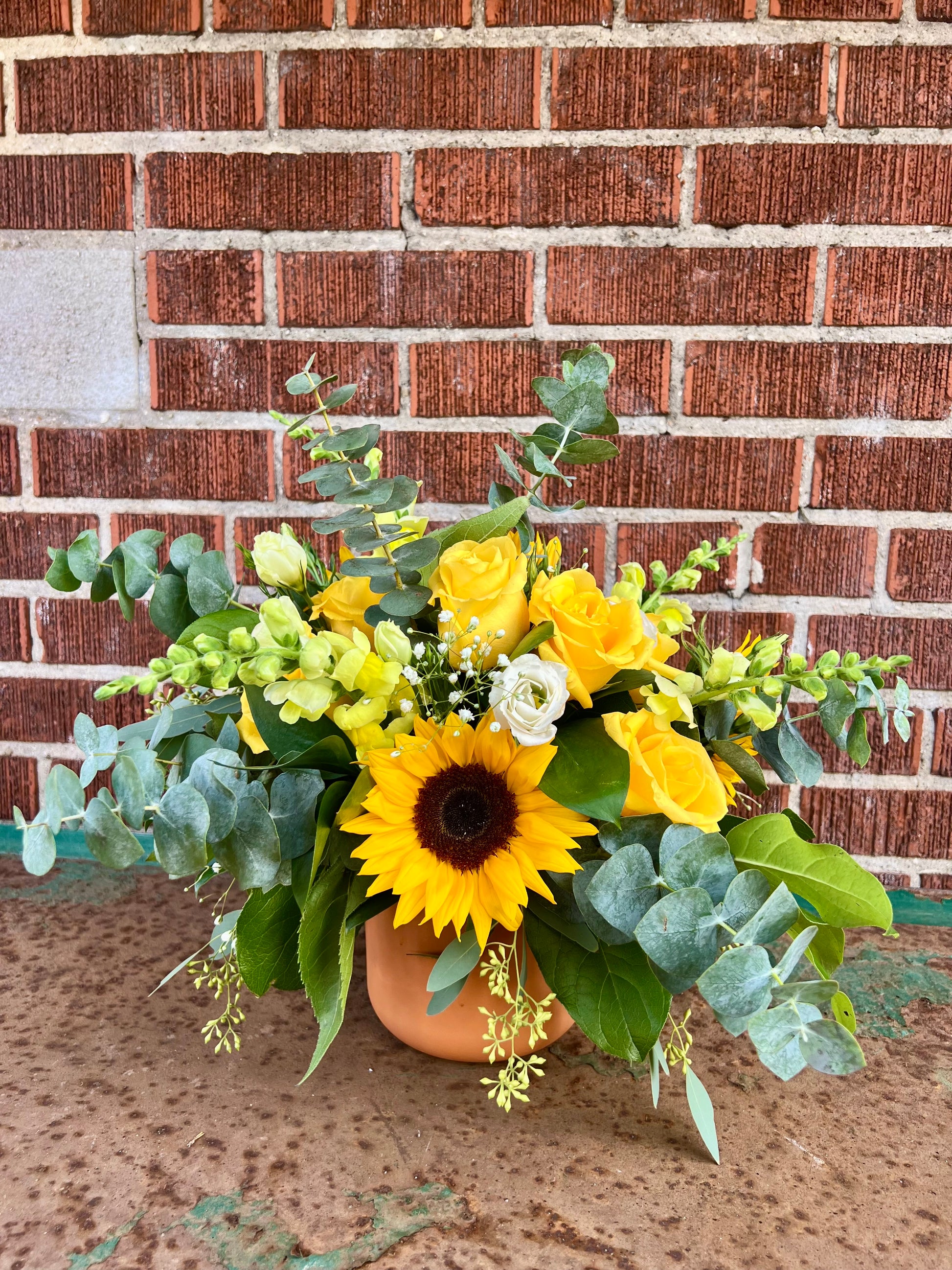 A fresh bouquet of sunflowers is a wonderful way to bring sunshine into your home. It is designed with an assortment of greenery and filler flowers for a decorative centerpiece.